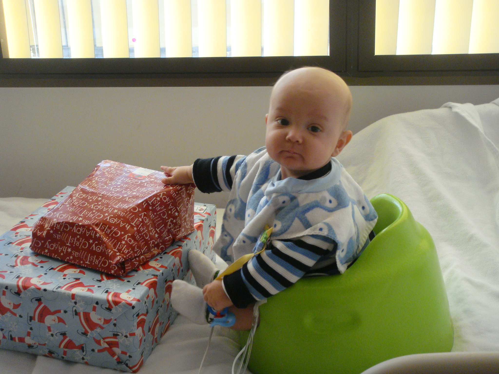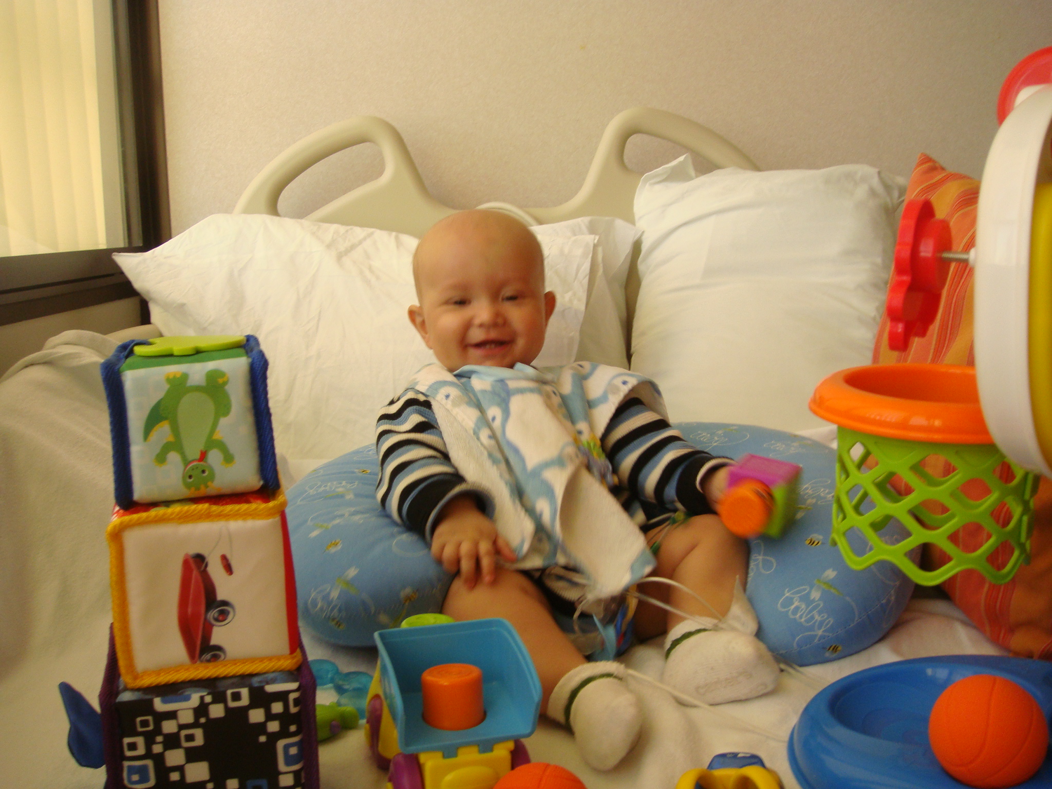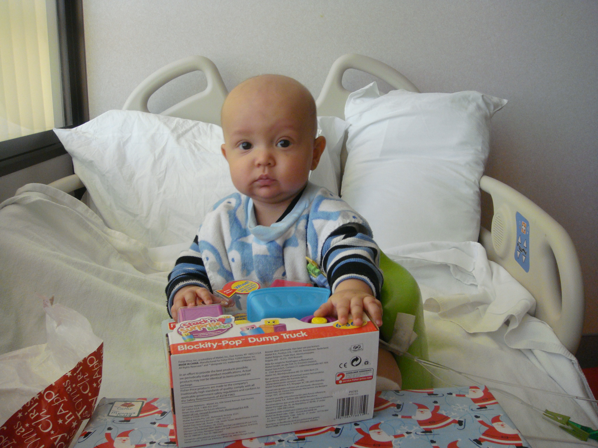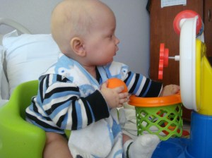 Cutler also received some presents that Melanie brought to the hospital for him to unwrap. Unfortunately I didn’t get to see how much he enjoyed the sound of the paper, I can attest to his love for the toys as he is still playing very hard whenever he is feeling good. Here are a few of the photos…