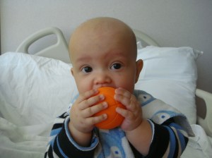 Now on to the current update for Cutler. First of all, I apologize for taking a few days off, but every now and then we need to enjoy the holidays as well. 🙂 Cutler is still doing fairly well and the doctors are very pleased with his progress. He is completely off pain meds and steroids as well as one antibiotic. Unfortunately it appears that he is experiencing some pain and his having trouble sleeping through the night…at least as of last night he was. He is also sneezing and coughing a lot, which I believe is still a bit of mucisitis residing that was successfully masked by the steroids. Today he even had one of his vomit/spit up moments, which the nurse believes was clotting left over from the major mucisitis.