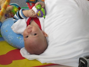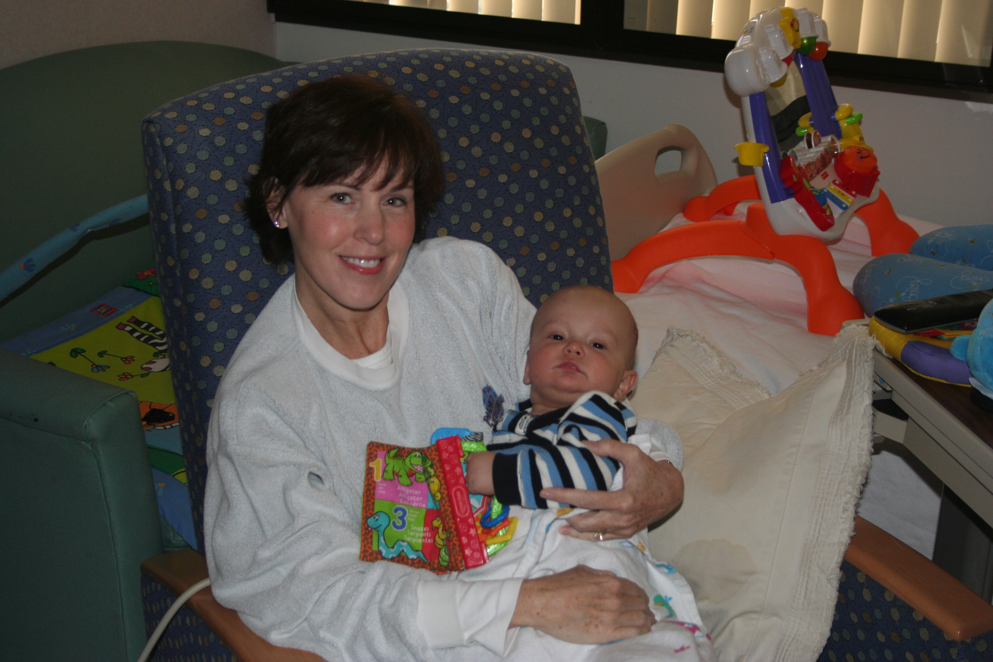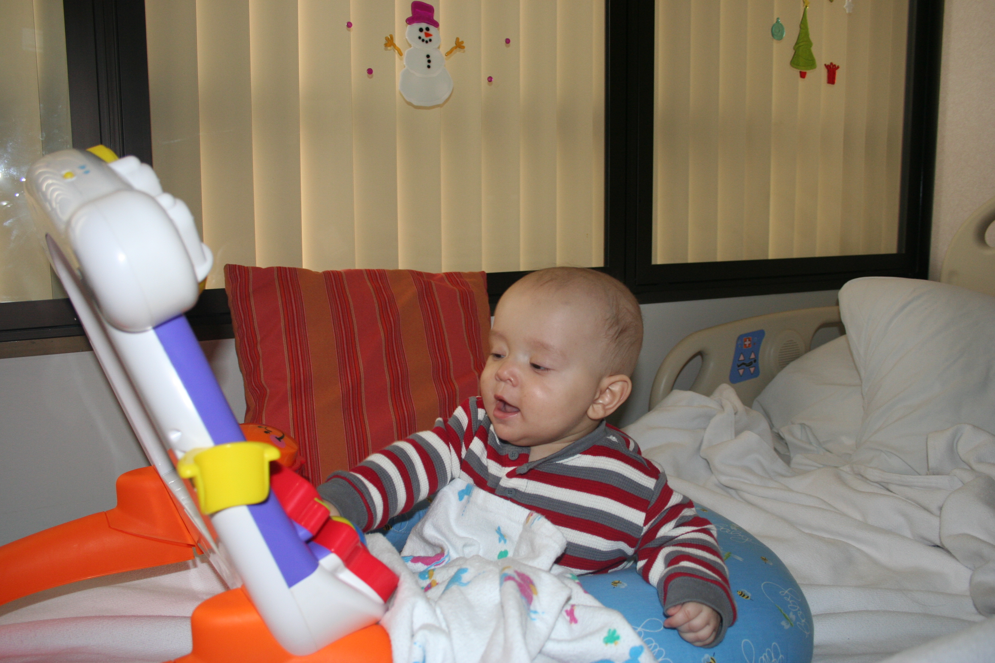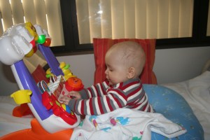 Last night was a bit of a rough night, but not for Cutler. At 3 am, Cutler woke up as happy as a peach and ready to play. Fortunately I was able to get him back to sleep a bit later, but these fun new IV pumps that they have installed keep me up all night with constant alarms going off and unfortunately if I don’t get up and call for the nurse, they would just wake Cutler. However, Cutler did manage to sleep through the alarms until a little after 8am and once again was ready to play.