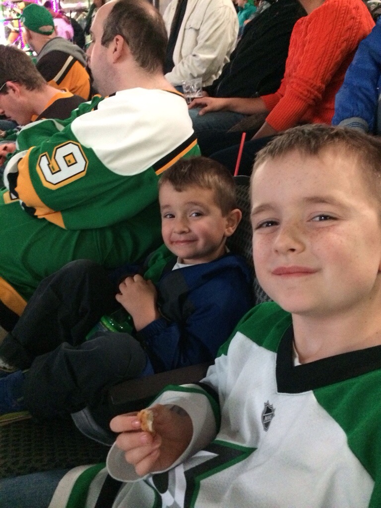 With Melanie still out of town the boys and I headed out tonight for a Stars game. After an interesting experience taking them both to a Rangers game this past summer I swore I would never do this again. However, with Melanie out I figured I would give it another shot and in the end I was pleased with the outcome. Aside from Cutler’s constant button pushing it was a great time. Only way it could have been better is if Melanie had been there. We miss her.
